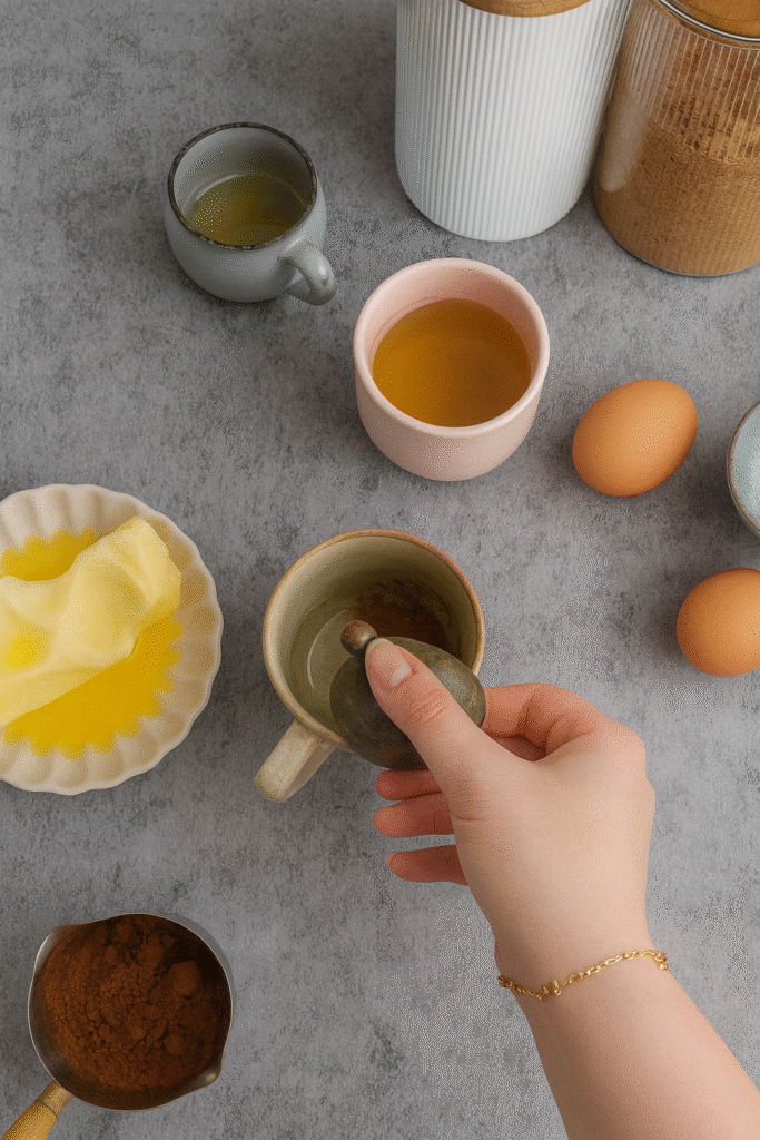 Prvo pomiješam vruću vodu, kakao i instant kafu. Ostavim to nekoliko minuta da se ohladi dok pripremam ostatak tijesta.