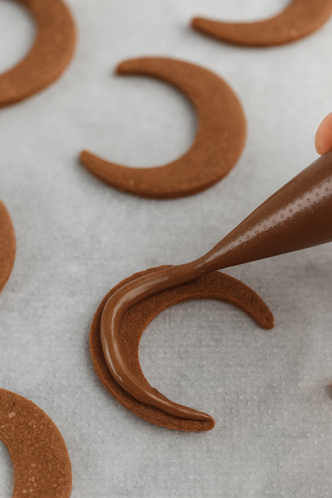 Na donju stranu jednog keksića stavim malu količinu namaza od kakaa i lješnjaka. Prekrijem ga drugim keksom i lagano pritisnem kako bi se punjenje lijepo rasporedilo.