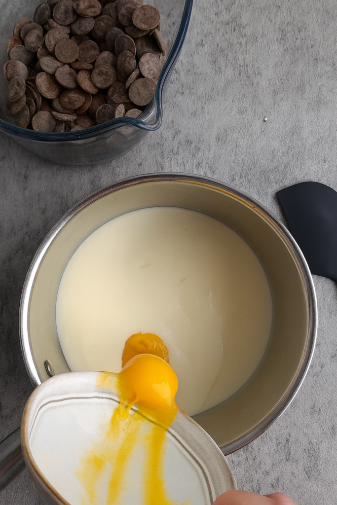 U šerpi pomiješajte mlijeko i žumanca. Kuhajte na laganoj vatri uz stalno miješanje, dok krema ne prekrije kašiku (ne smije prokuhati).