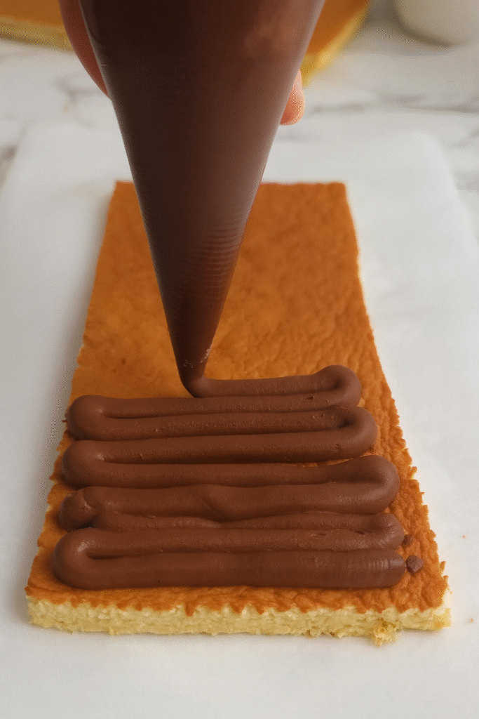 Kada se krema stegne, prebacim je u vrećicu za istiskivanje. Krema se nanosi u dugim, paralelnim linijama. Ovaj način nanošenja daje savršeno ravne i ujednačene slojeve, baš kao na videu.