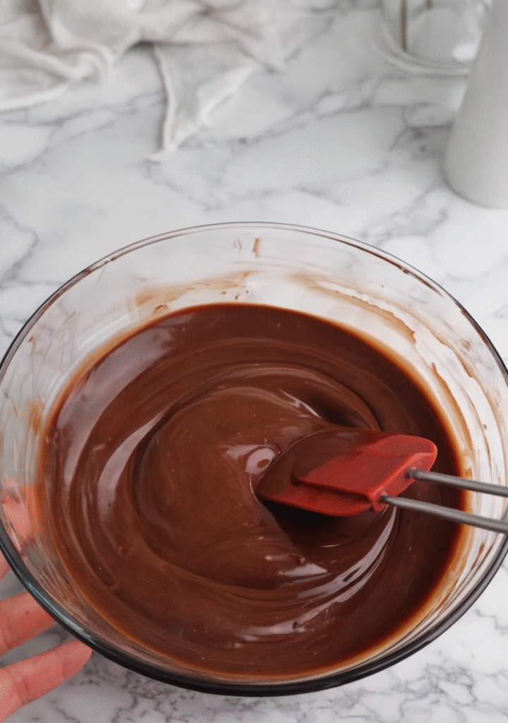 Čokoladu otopim zajedno s uljem i puterom. Kada postane glatka, prelijem je preko ohlađenog kolača. Zatim je poravnam dugom špatulom u jednom potezu. Nakon hlađenja glazura postaje potpuno glatka i sjajna.