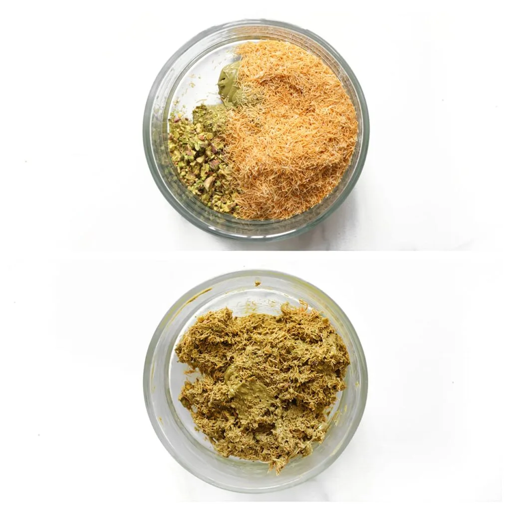 Pomiješajte pastu od pistacija sa pečenim kadaifom i pistacijama dok se ne sjedini. Ostavite ovo sa strane.