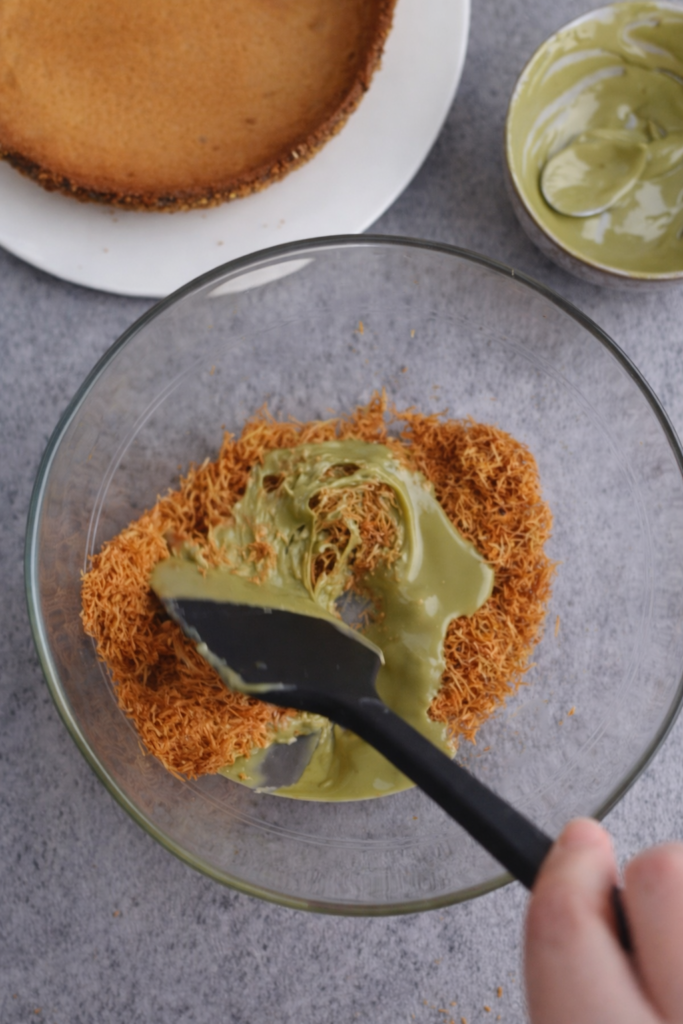 Kadaif prvo dobro razdvojite prstima. Stavite ga na suhu tavu i tostirajte na srednjoj vatri uz stalno miješanje, dok ne postane zlatan i hrskav. Pazite da ne potamni previše.