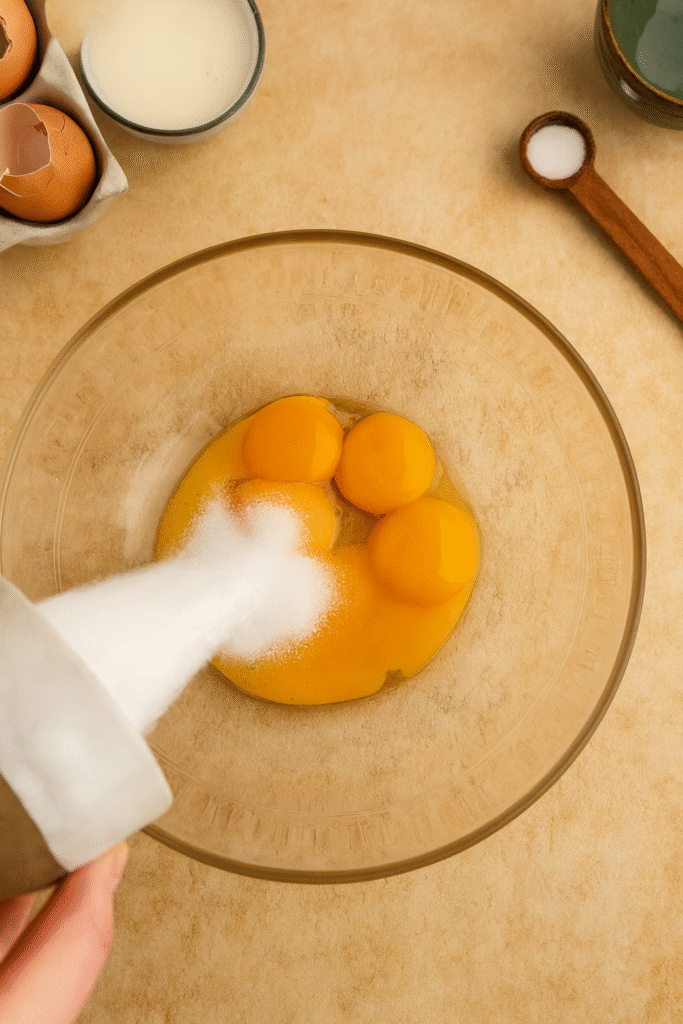 Prvo pomiješajte žumanjke sa 30 g šećera. Zatim dodajte mlijeko i ulje te dobro promiješajte. Nakon toga umiješajte brašno i prašak za pecivo.