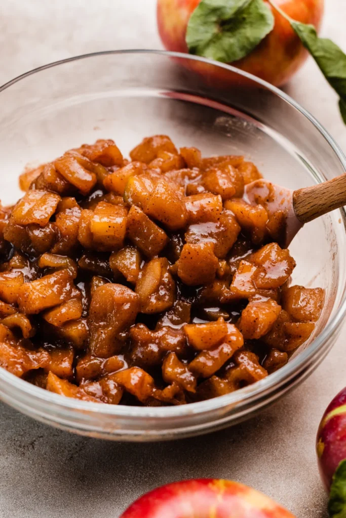 Jabuke operite i ogulite, a zatim ih isijecite na veličine zalogaja. Sve sastojke dodati u šerpu i kuhati 15 do 20 minuta, cijelo vrijeme lagano miješajući. Kuhanje završite kada fil postigne željenu mekoću. Smjesu ostaviti da se ohladi.
