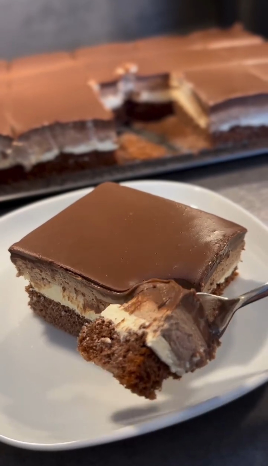 Jaja umutite sa šećerom i vanilijom dok smjesa ne postane svijetla i pjenasta. Dodajte mlijeko i ulje pa kratko promiješajte. U drugoj posudi pomiješajte brašno, kakao, prašak za pecivo i so. Suhe sastojke postepeno dodajte mokrima i lagano sjedinite. Smjesu izlijte u kalup obložen papirom za pečenje (promjer oko 26 cm). U zagrijanoj rerni na 180°C oko 25–30 minuta. Ostavite da se biskvit ohladi, pa ga prerežite na tri jednake kore.