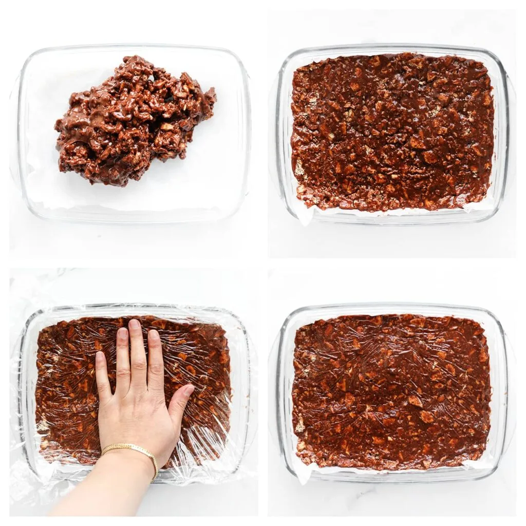Pleh obložite papirom za pečenje. Smjesu ravnomjerno rasporedite po plehu i jako pritisnite. Upotrijebite prozirnu foliju da poravnajte površinu.